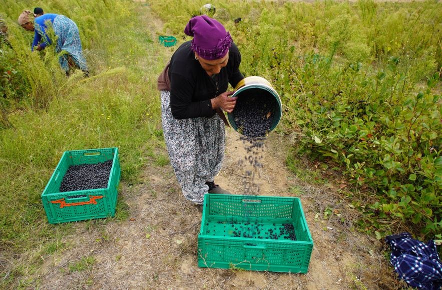 Tarım işçileri tarafından özenle toplanan aronya meyveleri kasalara doldurulup işlenmek üzere tesislere gönderiliyor.