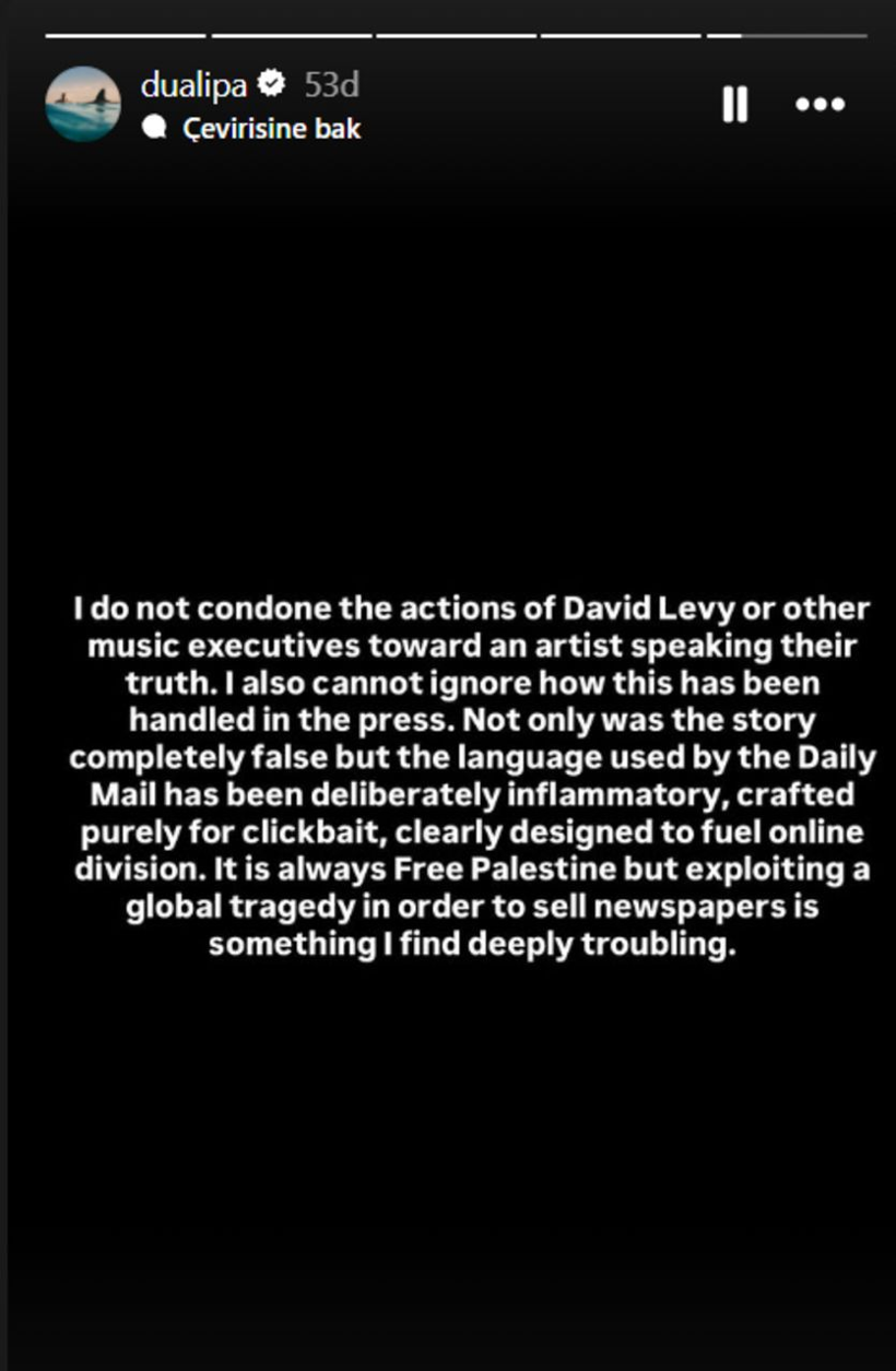 Ancak Dua Lipa, bu iddialar üzerine bir açıklama yaparak haberi yalanladı. Haberin tamamen yanlış olduğunu söyleyen ünlü şarkıcı, sosyal medya hesabından yaptığı açıklamada şu ifadeleri kullandı:
